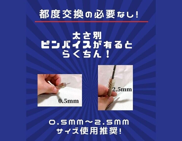 セット内容:収納式ピンバイス×3本セット。 ※ピンバイス3本付きなので、ドリルを3サイズで同時に使うなどの際、頻繋にドリルの交換は要らず、便利です。 リル刃つきませんのでご注意してください。 使い方: 頭部を手の平に当てるようにし垂直に力を入れて回します。 頭部が回転することで、安定してご使用いただけます。 ピンバイスをビットブレードやスジボリカーバイト用に使用すると便利です。このピンバイスは軸径0.5mm〜2.5mmのドリルビットやカーバイトに適しています。 3mmでも使用できるというお声を頂きます。キツイ場合、熟練技術者の方は、ドリルやリューターを使って簡単に適合できるよう工夫をされています。 何よりサイズ毎に固定軸を用意しておけば作業効率が大幅にアップすることが利点です。