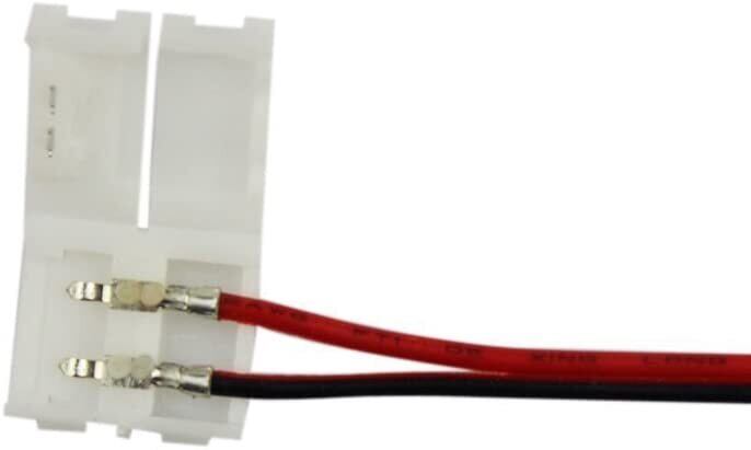 半田付け不要です。 サイズは長約16cmです。 単色LEDテープライトの2線配線に使用できる。 テープ幅8mmの3528 単色LEDテープ用の延長ケーブルです。 ケーブル長さは15cmを用意しています。曲がり角でもご使用できます。 2本をつなぎ合わせてご自宅の外壁、店の内装などにご利用にる際、柱などの障害物をよけるための、コードとしても便利です。