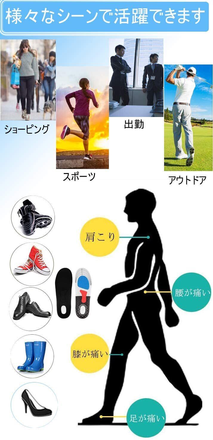 【 インソール 中敷き で改善が期待できる効果 】かかとのゲルは、それぞれの足の踏み込み時の 衝撃を吸収します、あなたの足の疲れを和らげる効果が期待できます。理想的な 足のバランス になり、血行促進 から 疲労軽減 、 膝痛 、 腰痛 、 肩こり などを軽減し、ケガを未然に防ぐことにつながります。